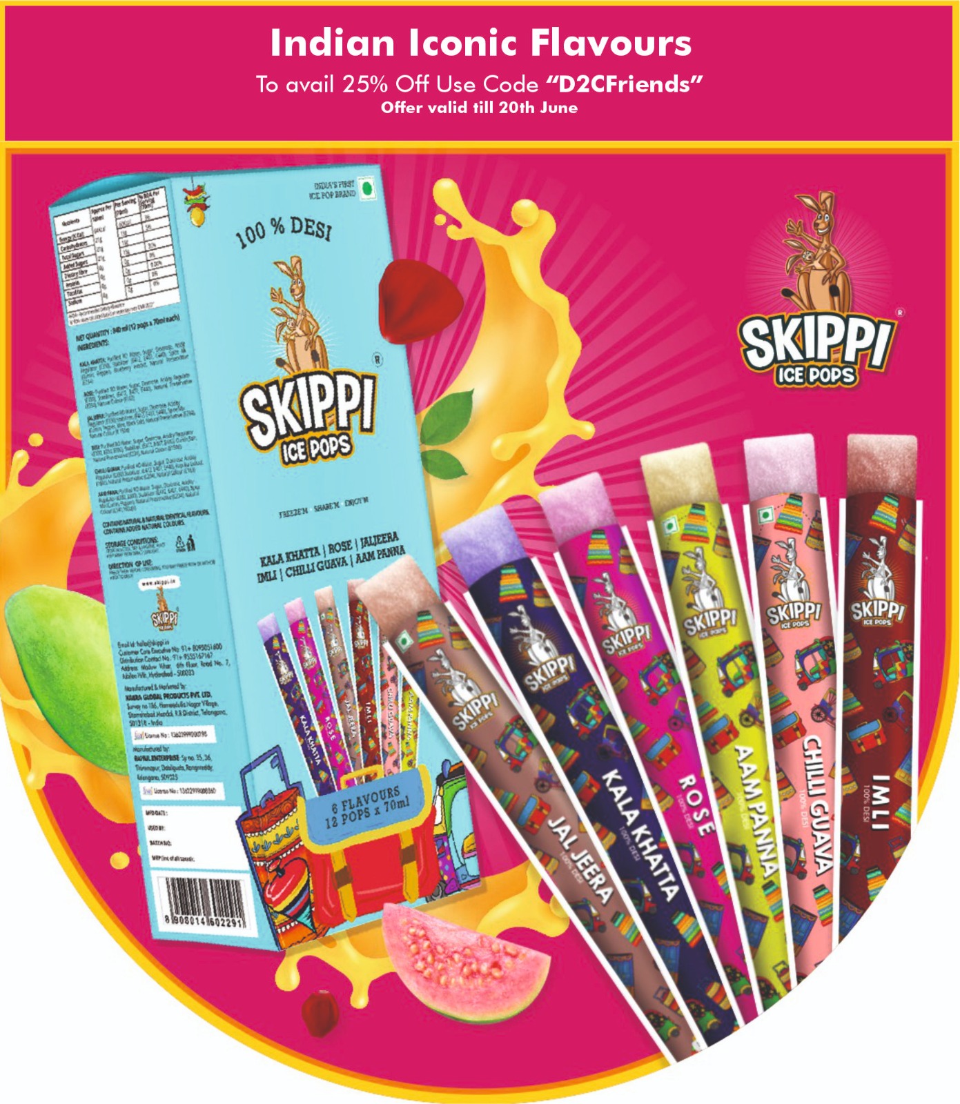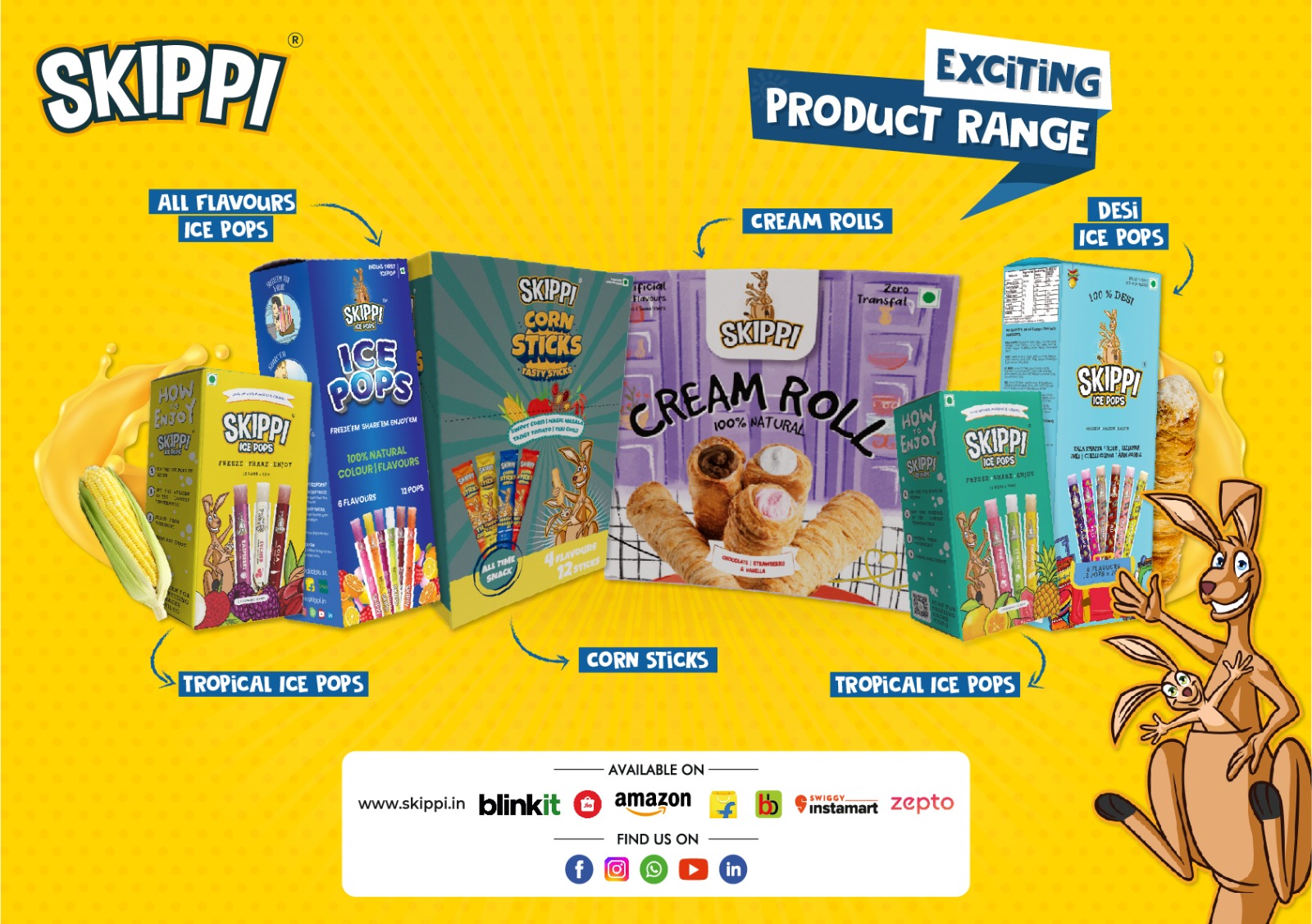 Skippi Icepops is India's First Icepops and is made from a self owned Patented technology using 100% Natural Colours, Natural Flavours, Natural Sweeteners and Natural Preservatives. Skippi has now advance to become a fast moving FMCG brand of India with added products as Skippi Corn sticks and Skippi Cream rolls. Many more to come!