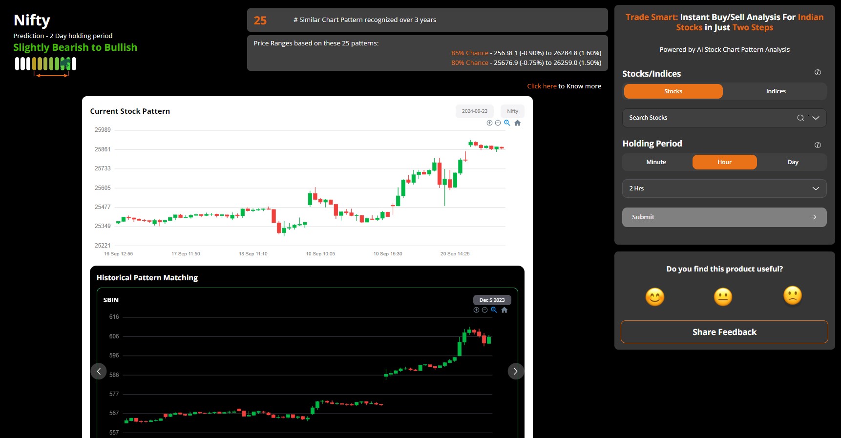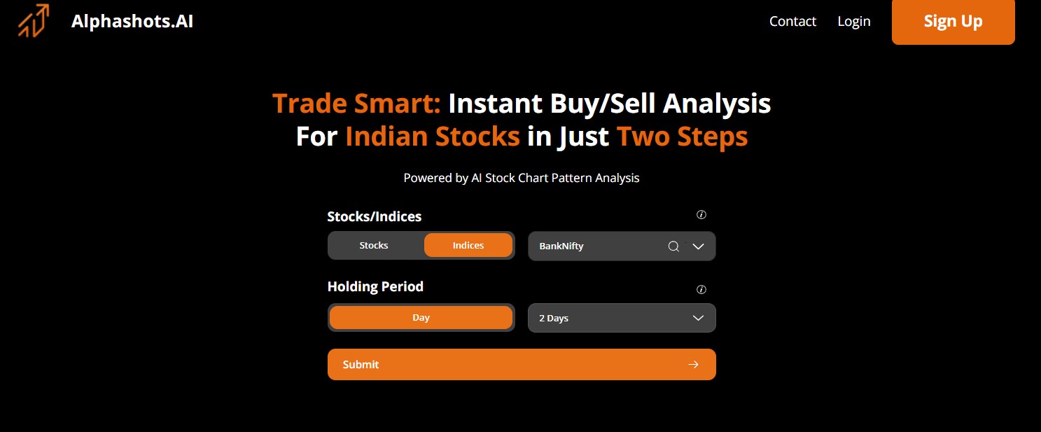 Alphashots.AI looks at stock patterns today and compares them to millions from history. In 30 seconds, it tells traders the chances of prices going up or down, helping them decide to buy or sell. The Base Product offers stock predictions based on pattern matching, with 3 AI stock recommendations per query by scanning all stocks every 30 minutes. Additionally, users receive 2 more stock suggestions via email and transparent analytics at the end of the day. The Options Product provides underlying stock predictions through pattern matching and delivers optimized option strategies to balance risk and return in the current market scenario. In the pipeline, we plan to integrate with brokers for seamless buy/sell actions in a single click and offer personalized WhatsApp alerts for users. For advanced users, we are developing features that combine quantitative and qualitative fundamental factors using Finance-Flash. Users will also be able to generate custom analyst reports, as well as utilize an advanced stock scanning and alerting system.
