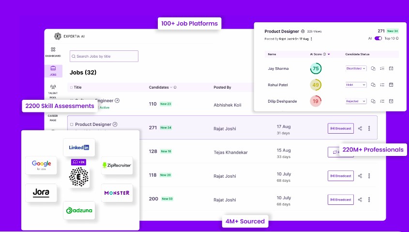 AI-powered screening and assessments: find and interview top candidates from 100+ platforms and hire in 24 hours, all at <10% of the cost. Global Businesses with more than 5000 employees, hiring up to 500 employees per year using traditional tools like ATS, Job Boards, and Agencies, struggling to automate the identification of top candidates. "Hiring involves several repetitive steps across multiple platforms, losing data and context. Bringing an end-to-end solution to solve hiring has never been done before. This requires self-learning algorithms, data mining, and workflow automation. The self-learning algorithms, natural language processing, hyper profiling of web metadata, power our AI Recruiter which assesses and engages with candidates to identify the Top 10 professionals for a given role. Every job applicant is assigned an Expertia score and a rank with respect to the job role and other candidates respectively after identifying Hidden Skills, Validating intent, analyzing culture fit and predicting their Career Paths.