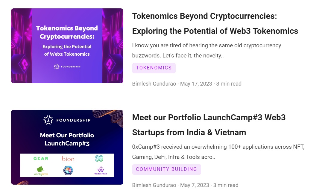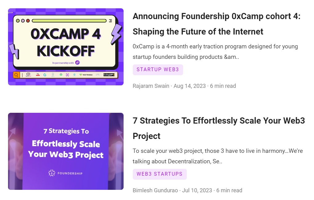 An Web3 Startup Acceleration Platform to enable Web3 Startups to accelerate. Foundership Acceleration Platform has the following features: Startup Program Management: Foundership runs 3 programs to enable Web3 ideas to get started, incubated and accelerated. Coach Collaboration: Coaches from across the world collaborate in real time to work with startups to help them launch and scale in their pre-seed stage. Community 'Market' Access: Foundership continuously builds users from across the world to enable Startups to get beta users. Capital Support: A dedicated investment team to help founders to raise capital. Partnership Management: Foundership brings partners to collaborate for startups' funding and solution needs.