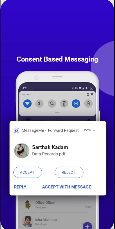 * MessageMe is a first ever consent based enterprise messaging platform with ultimate Monitoring, Controlling and Forensic traceability for highly sensitive organizations. * It is a self hosted, quantum secure messaging platform with ultimate data loss prevention capabilities within itself. * The data being shared over the platform is completely based on the owner’s consent and hence spread of data can be restricted and identified. * With an advanced Admin dashboard - the executives will be able to trace the forwards, build the audit reports and control the data being shared internally. * In a nutshell, MessageMe is changing the way enterprises communicate with their employees, 3rd party vendors and external entities to enable smooth and centralized communications with ultimate control, traceability and monitoring capabilities over the data. MessageMe: secure enterprise messenger: * Hybrid encryption with Quantum technology: reduces the chances of cyberattacks with advanced quantum-based encryptions. * Consent-based data sharing: works on the principle of consent, where ownership remains with the creator of data. * Messaging forensics & audit: track the file sharing through the admin panel and trace the user in case of compromise. * Administrative control: control, monitor, and remotely wipe the communications through the dashboard.