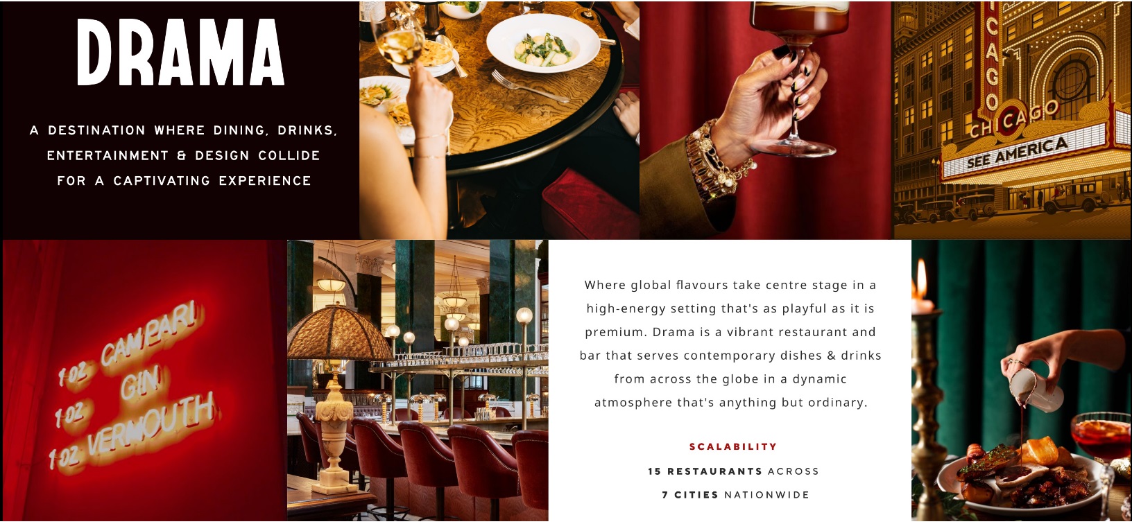 A destination where dining, drinks, entertainment and design collide for a captivating experience Where global flavours take centre stage in a high-energy setting that's as playful as it is premium. Drama is a vibrant restaurant and bar that serves contemporary dishes and drinks from across the globe in a dynamic atmosphere that's anything but ordinary. Scalability 15 Restaurants Across 7 Cities nationwide