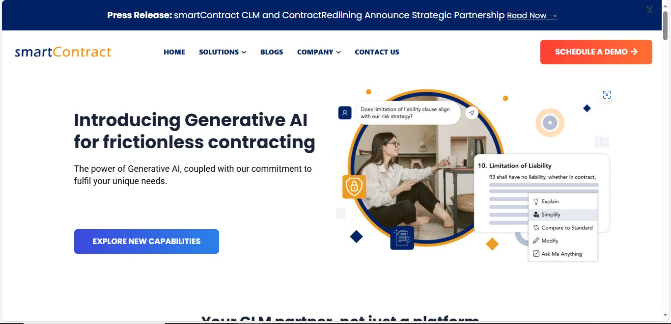Smart Contract CLM provides an AI-driven, automated Contract Lifecycle Management (CLM) platform designed to streamline contract creation, management, and compliance. Key features include: • Faster contract drafting and execution. • Automated workflows for approvals and compliance tracking. Comprehensive Risk & Compliance Management • Structured obligation management to ensure all contractual commitments are met. • Automated audit trails to maintain regulatory compliance. Seamless Integration • Connects with procurement, finance, HR, and IT systems. • Provides real-time visibility into contracts, payments, and vendor performance. Data-Driven Insights & Analytics • Identifies cost-saving opportunities. • Tracks vendor obligations and contract efficiency metrics. Customization & Flexibility • Adaptable to unique business needs with industry-specific templates. • Supports diverse contract types, including sales agreements, SaaS agreements, and legal filings.