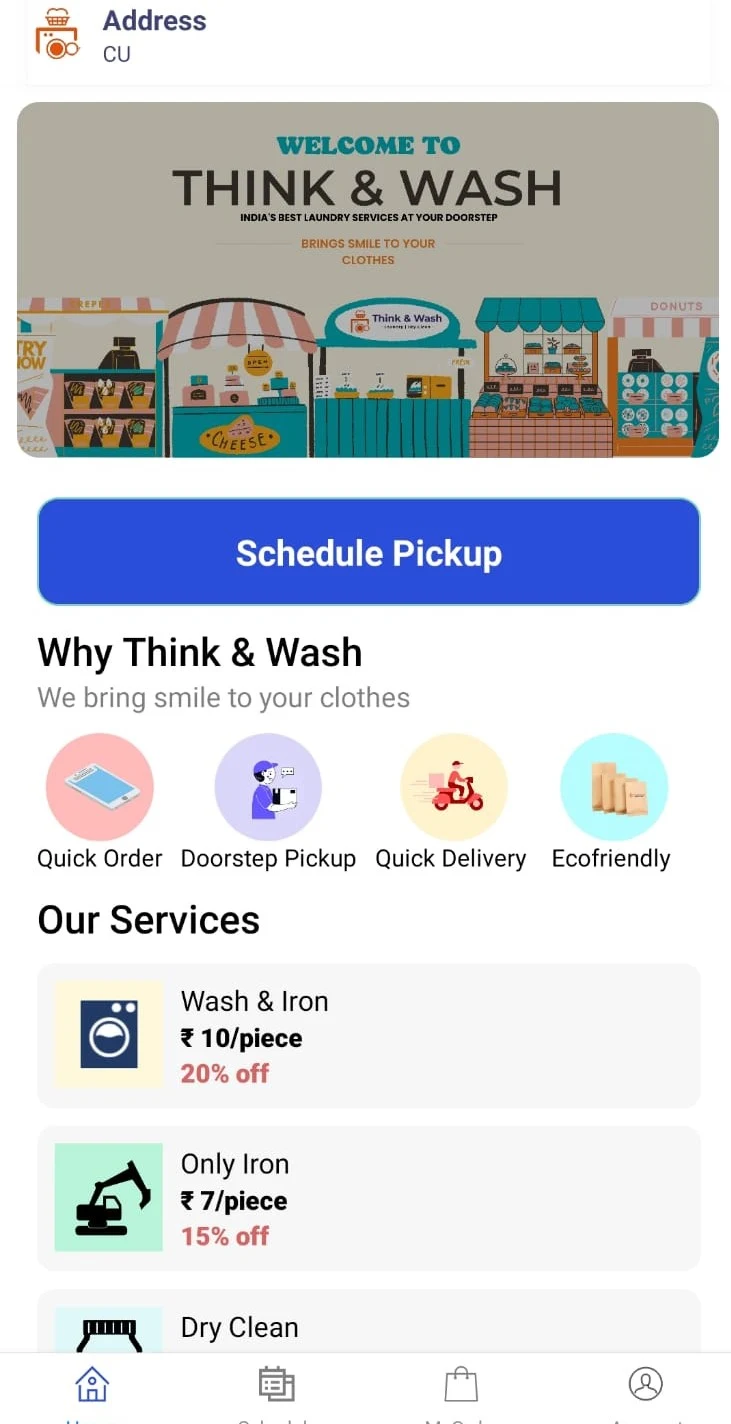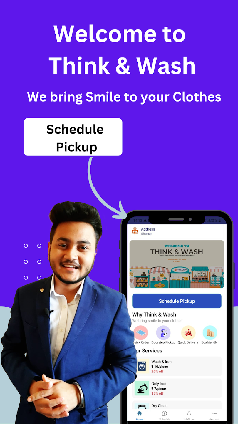 A laundry and dry clean service providing startup founded with an intent to bring revolution to unorganized laundry sector We at Think and Wash promise to provide best possible service to our customer at most affordable Price. Our team consists many brilliant faces who are expert in their field. A young startup started to ease human effort and bring professionalism over formalism in laundry sector. Our Services: * Dry Cleaning * Wash & Iron * Shoe Cleaning * Iron Only How We Work? 1) Order Place 2) Free Pick Up 3) Processing 4) Free Delivery Out top-notch features: * Reliable Laundry Services, Tailored for You. * Brightening Your Wardrobe, One Wash at a Time. * India's best laundry service at your doorstep. A young startup started to ease human effort and bring professionalism over formalism in laundry sector. * Quality Laundry Service * 24hrs Fast Delivery * Free Door-Step Pickup * 100% Satisfaction Guarantee