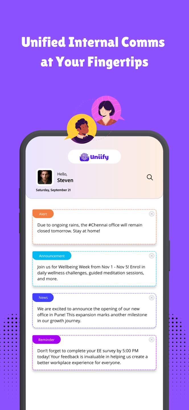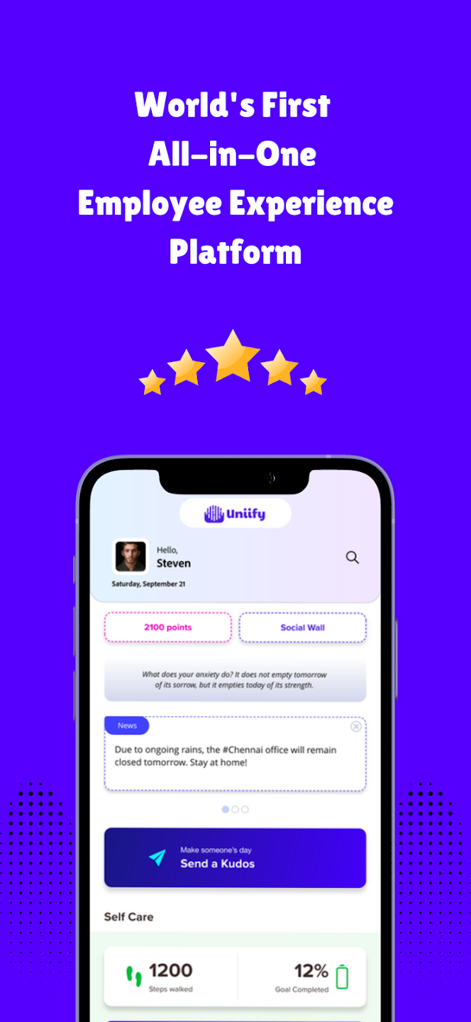 Uniify is an AI-powered Employee Experience platform that integrates Engagement, Well-being, and Internal Communications into a single solution. It helps organizations create a connected, motivated, and productive workforce. Key Offerings: ✅ Employee Engagement – Gamified challenges, recognition programs, AI-driven sentiment analysis, and pulse surveys. ✅ Well-being & Wellness – Personalized wellness content, step-based challenges, stress management tools, and guided mindfulness exercises. ✅ Internal Communication – AI-enhanced announcements, image-based surveys, and an engaging social wall for real-time interactions. ✅ Analytics & Insights – AI-powered dashboards, engagement reports, and predictive analytics for HR teams. ✅ HR Automation & Integrations – Seamless integration with existing HRMS tools for automated workflows.